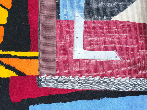 Travail contemporain d’artisans, multicolore dans les tons blue, jaune, vert, marron foncé, rouge, beige et noir. Tissé a la main de velours la laine soigneuse sur fondations en coton.