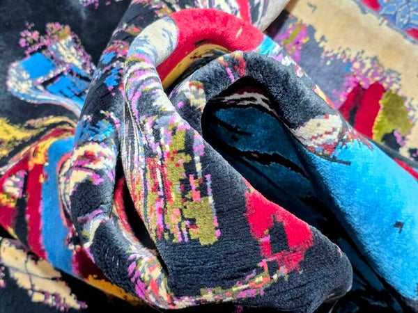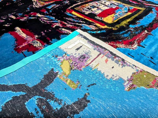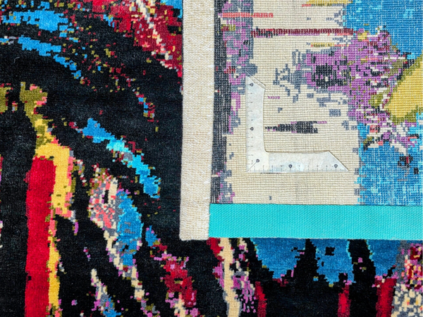 Travail contemporain d’artisans, multicolore dans les tons blue, jaune, vert, rouge, pink, gris, beige et noir. Noué a la main de Velours la laine soigneuse (Mérinos) sur le tram en coton.