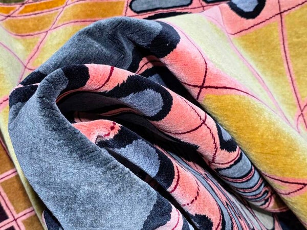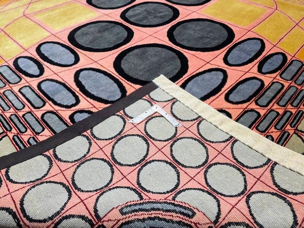 Travail contemporain d’artisans, multicolore dans les tons pink, jaune clair, jaune foncé, grise clair, gris foncé et noir. Noué à la main de Velours la laine soigneuse (Mérinos) sur la Chaîne en coton.