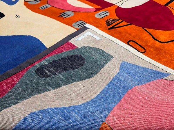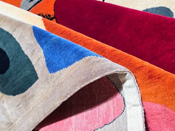Travail contemporain d’artisans, multicolore dans les tons rouge, bleu, verte, orange, marron clair, argent, beige et noir. Noué à la main de Velours la laine soigneuse (Mérinos) sur la Chaîne en coton.