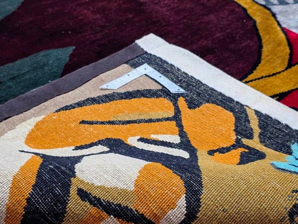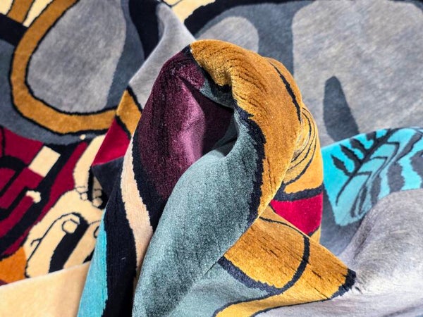 Travail contemporain d’artisans, multicolore dans les tons bleu ciel, verte, rouge, orange, marron clair, marron foncé, argent, gris, beige et noir. Noué à la main de Velours la laine soigneuse (Mérinos) sur la Chaîne en coton.
