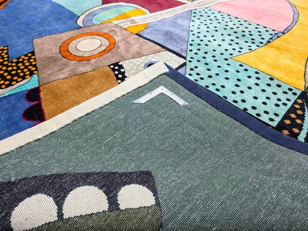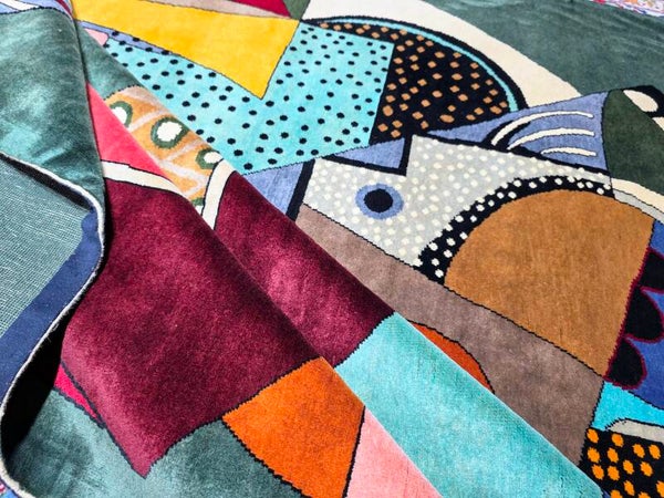 Travail contemporain d’artisans, multicolore dans les tons rouge, verte, pink, blue, jaune, marron, beige et noir. Noué à la main de Velours la laine soigneuse (Mérinos) sur la Chaîne en coton.