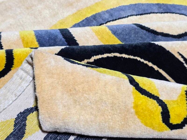 Travail contemporain d’artisans, multicolore dans les tons rouge, jaune, orange, beige et noir. Noué à la main de Velours la laine soigneuse (Mérinos) sur la Chaîne en coton.