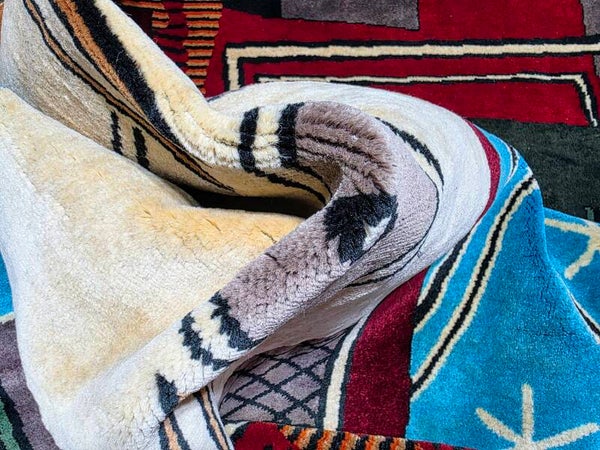 Travail contemporain d’artisans, multicolore dans les tons rouge, bleu, verte, marron foncé, purple, beige et noir. Noué à la main de Velours la laine soigneuse (Mérinos) sur la Chaîne en coton.