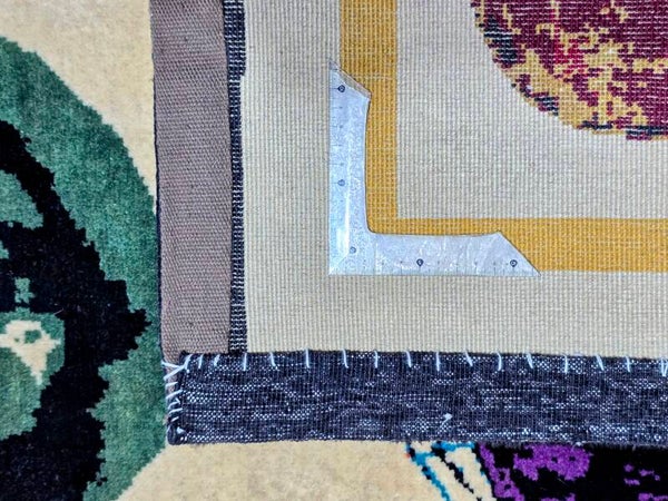 Travail contemporain d’artisans, multicouleur dans les tons vert, blue, rouge, bordeaux, orange, pistache, jaune, saumon, violet, beige et noir. Noué a la main de Velours la laine (Mérinos) sur le Chaîne en coton.