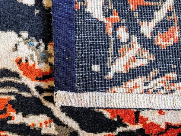 Travail contemporain d’artisans, multicouleur dans les tons blue, orange, pistache clair, beige et noir. Noué a la main de Velours la laine (Mérinos) sur le Chaîne en coton.
