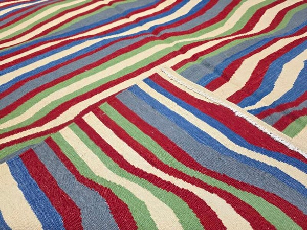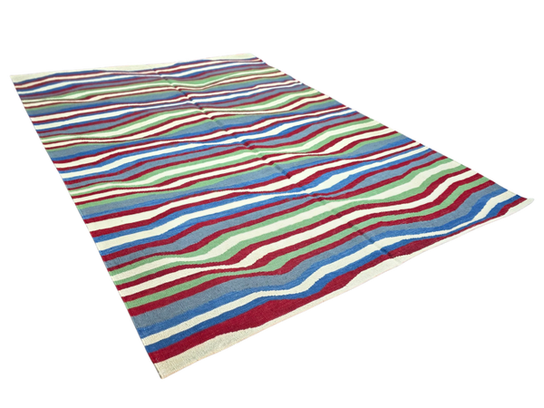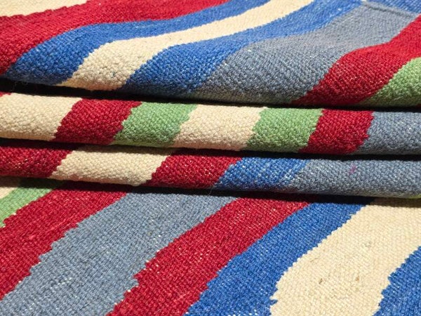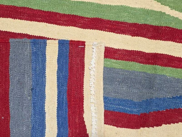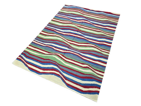 Travail contemporain d’artisans, multicolore dans les tons vert et beige. Tissé à la main de la laine mouton soigneuse sur la chaîne en coton.