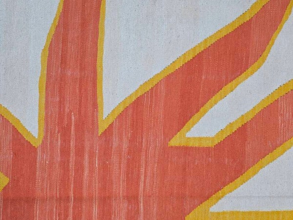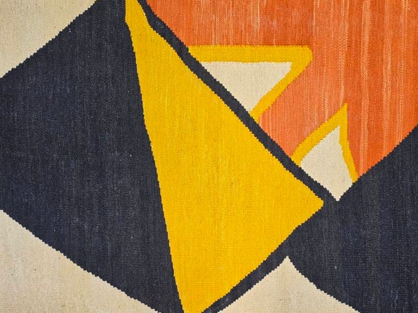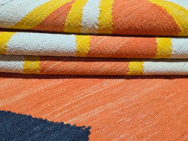 Travail contemporain d’artisans, multicolore dans les tons bleu, jaune, orange, beige et noir. Tissé à la main de la laine mouton soigneuse sur la chaîne en coton.