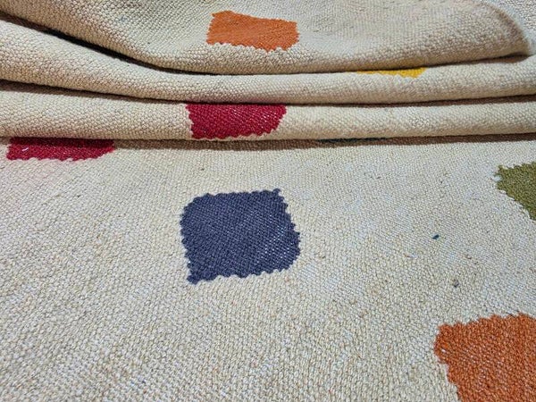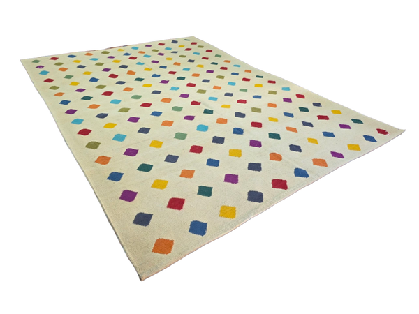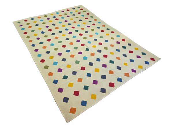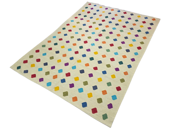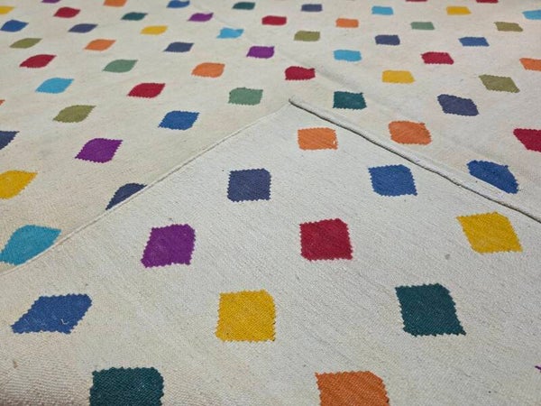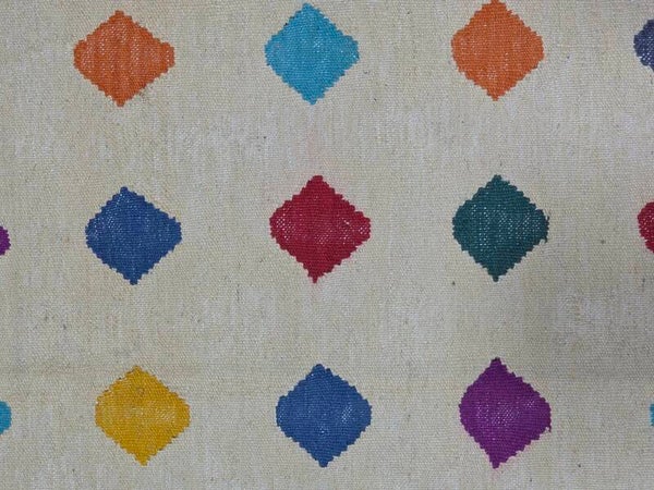 Travail contemporain d’artisans, multicolore dans les tons verte, bleu, rouge, jaune, orange, violet, beige et bleu clair. Tissé à la main de la laine mouton soigneuse sur la chaîne en coton.