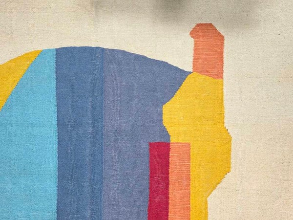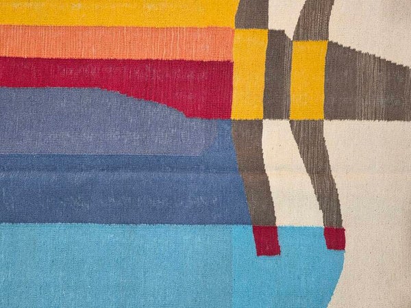 Travail contemporain d’artisans, multicolore dans les tons bleu, rouge, jaune, orange clair, bleu clair, gris, marron et beige. Tissé à la main de la laine mouton soigneuse sur la chaîne en coton.