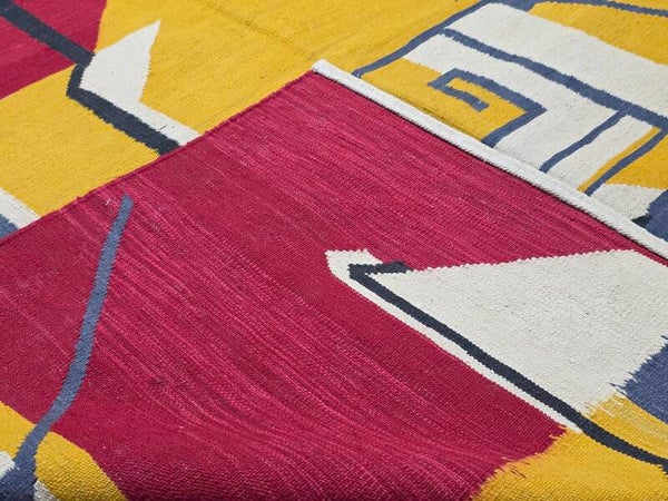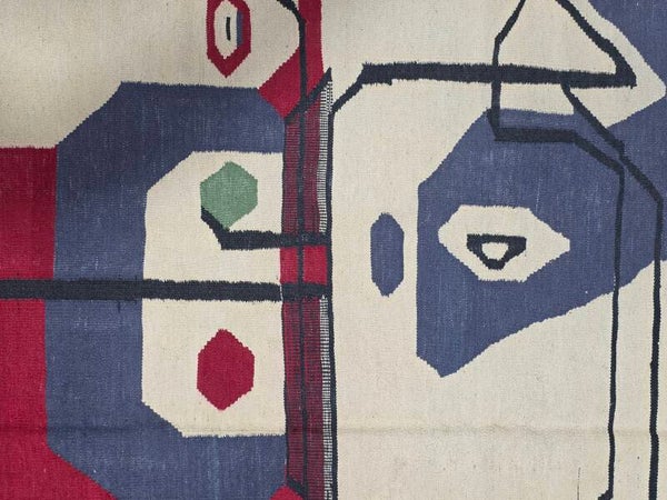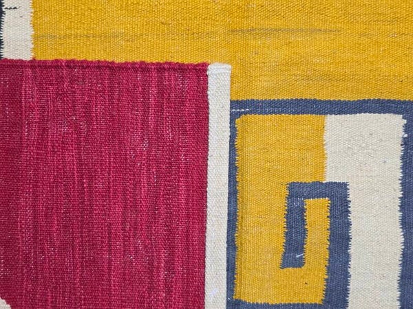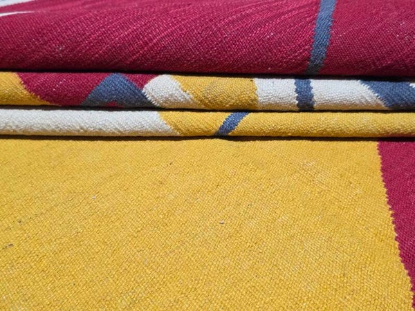 Travail contemporain d’artisans, multicolore dans les tons rouge, jaune, bleu, gris, beige et noir. Tissé à la main de la laine mouton soigneuse sur la chaîne en coton.