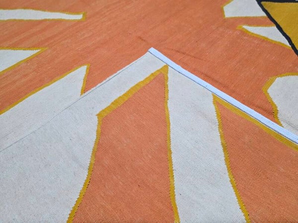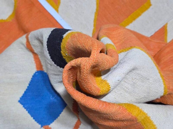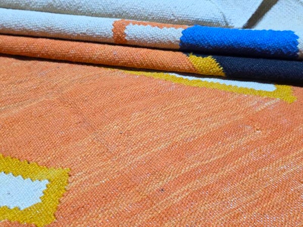 Travail contemporain d’artisans, multicolore dans les tons bleu, jaune, orange, beige et noir. Tissé à la main de la laine mouton soigneuse sur la chaîne en coton.