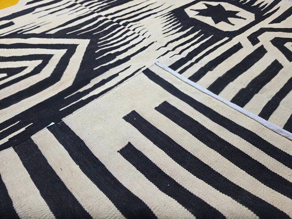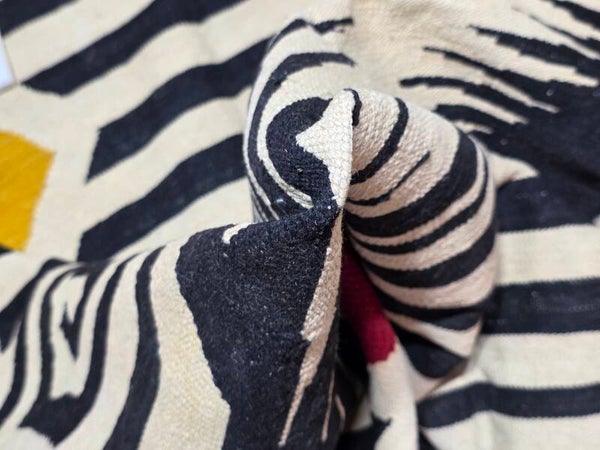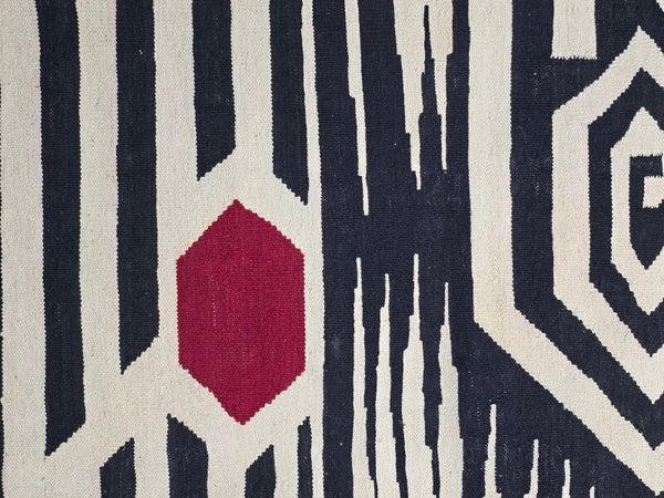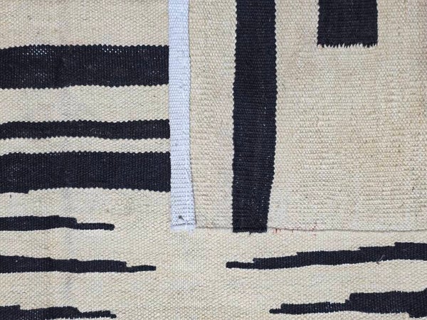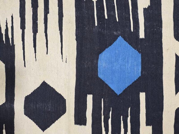 Travail contemporain d’artisans, multicolore dans les tons bleu, jaune, rouge, beige et noir. Tissé à la main de la laine mouton soigneuse sur la chaîne en coton.