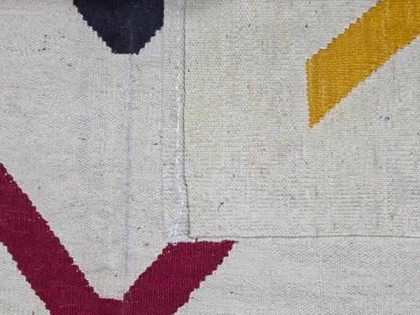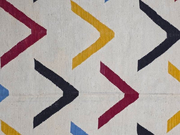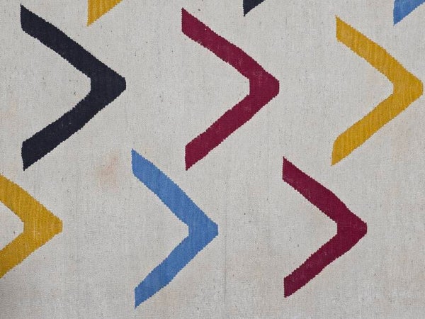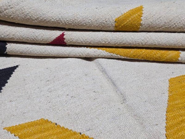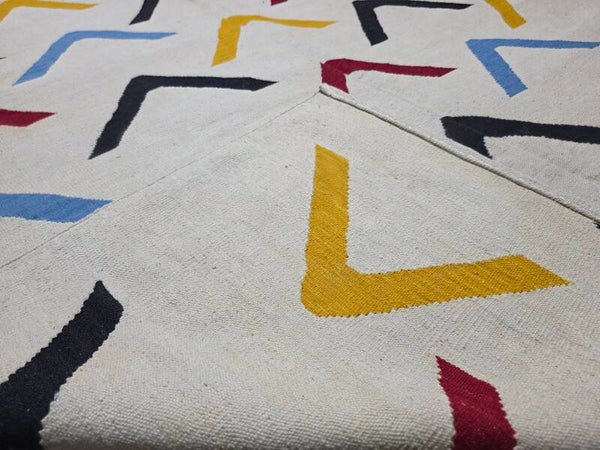 Travail contemporain d’artisans, multicolore dans les tons bleu, jaune, rouge, beige et noir. Tissé à la main de la laine mouton soigneuse sur la chaîne en coton.