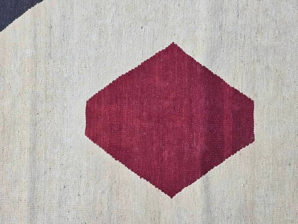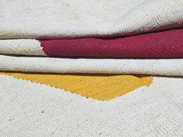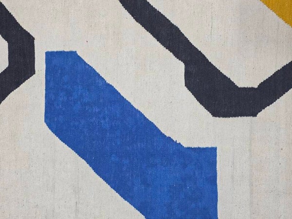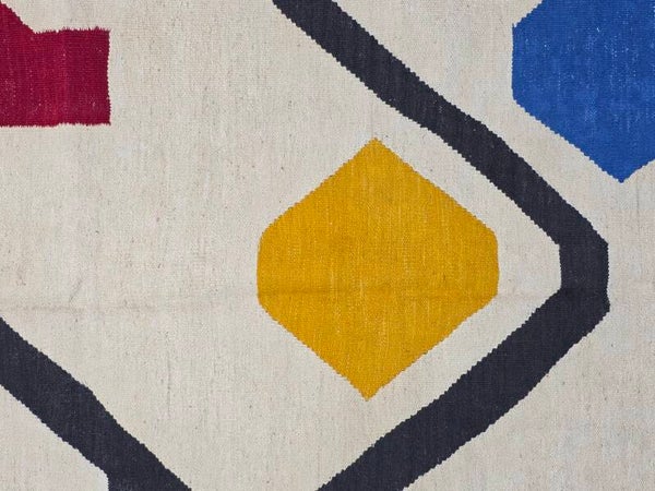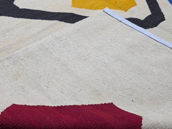 Travail contemporain d’artisans, multicolore dans les tons bleu, jaune, rouge, beige et noir. Tissé à la main de la laine mouton soigneuse sur la chaîne en coton.