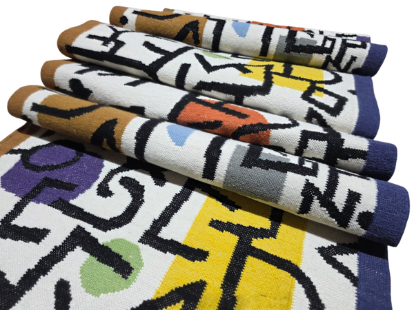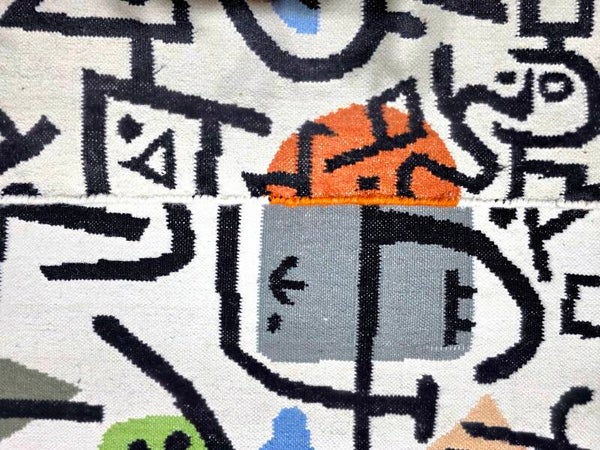 Travail contemporain d’artisans, multicolore dans les tons verte, bleu, jaune, orange, marron, gris, violet, beige et noir. Tissé à la main de la laine mouton soigneuse sur la chaîne en coton.