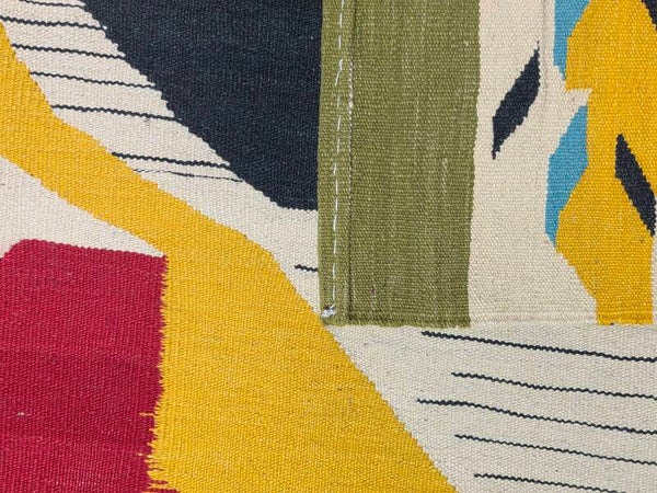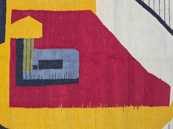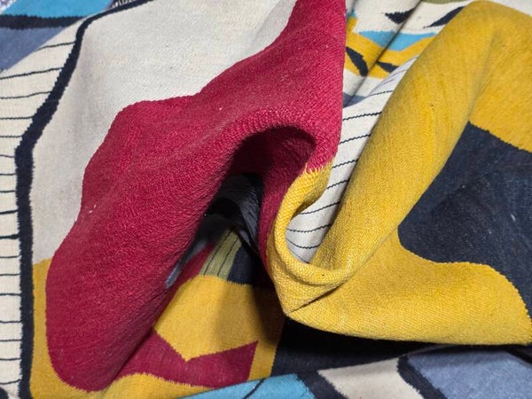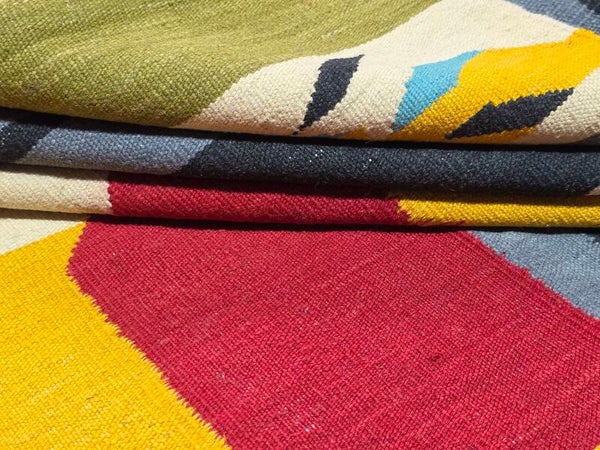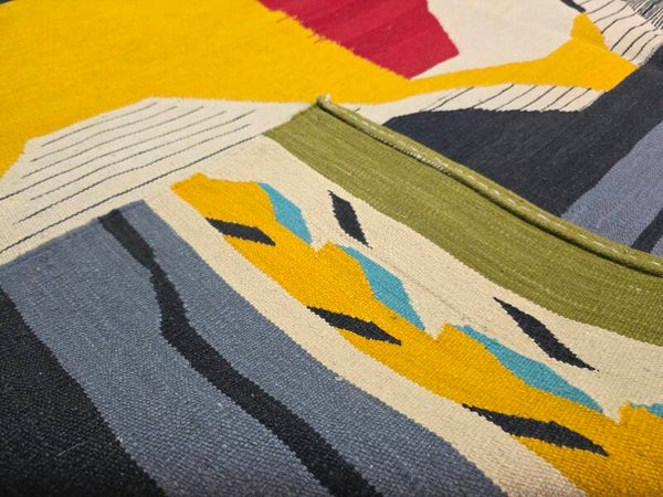 Travail contemporain d’artisans, multicolore dans les tons rouge, jaune, tourqoise, gris, pistache, beige et noir. Tissé à la main de la laine mouton soigneuse sur la chaîne en coton.