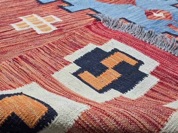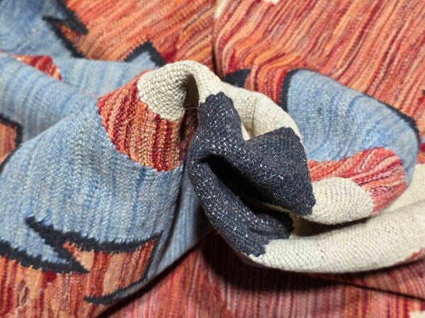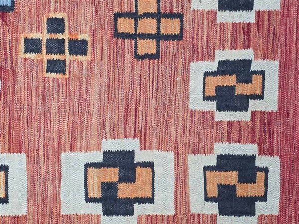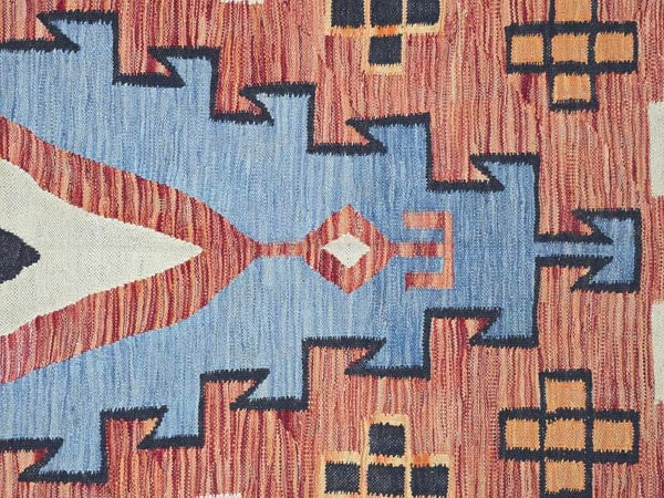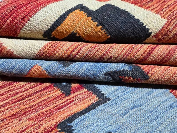 Travail contemporain d’artisans, multicolore dans les tons turquoise, rouge clair, orange clair, beige et noir. Tissé à la main de la laine mouton soigneuse sur la chaîne en coton.