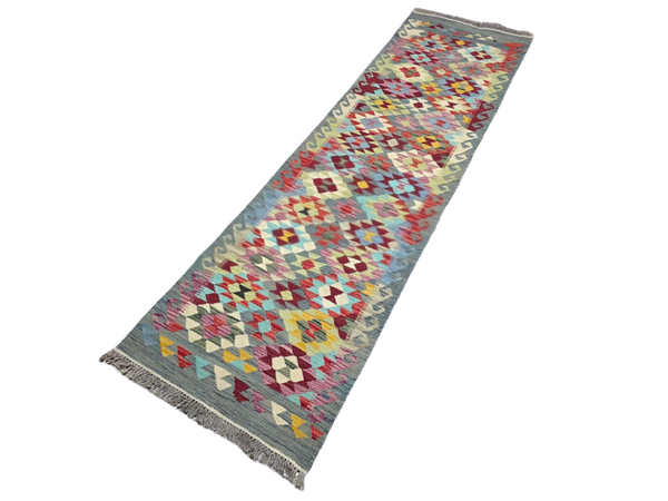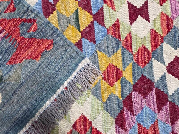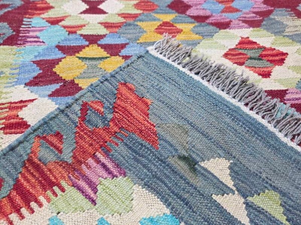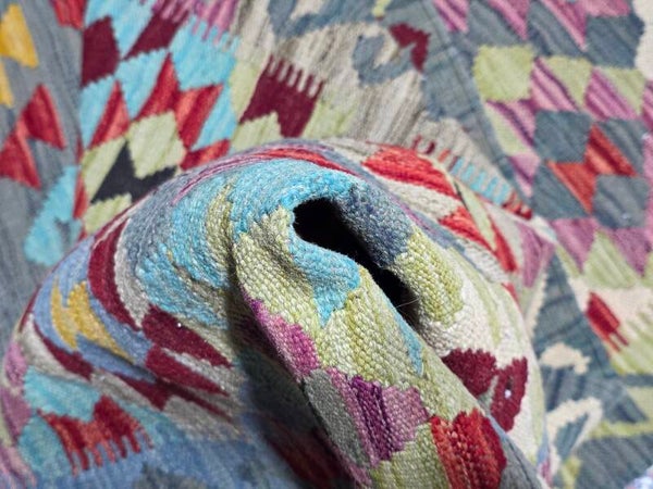 Le Kilim afghan est un type de tapis qui se distingue par sa technique de tissage et son origine tribale. Contrairement aux tapis afghans traditionnels qui sont noués, les kilims sont tissés, ce qui leur confère des caractéristiques uniques. Le kilim afghan est un tapis tissé à plat, sans velours, ce qui le rend léger et souvent réversible. Fabriqué traditionnellement en laine de mouton, il se caractérise par ses motifs géométriques et ses couleurs vives obtenues à partir de teintures naturelles. Il s'agit d'un artisanat tribal qui reflète les traditions des peuples nomades afghans.
