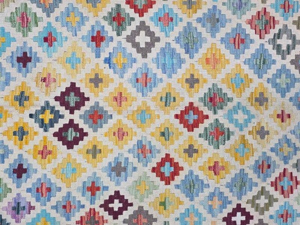 Le Kilim afghan est un type de tapis qui se distingue par sa technique de tissage et son origine tribale. Contrairement aux tapis afghans traditionnels qui sont noués, les kilims sont tissés, ce qui leur confère des caractéristiques uniques. Le kilim afghan est un tapis tissé à plat, sans velours, ce qui le rend léger et souvent réversible. Fabriqué traditionnellement en laine de mouton, il se caractérise par ses motifs géométriques et ses couleurs vives obtenues à partir de teintures naturelles. Il s'agit d'un artisanat tribal qui reflète les traditions des peuples nomades afghans.