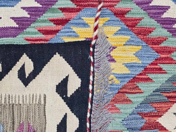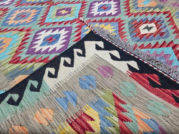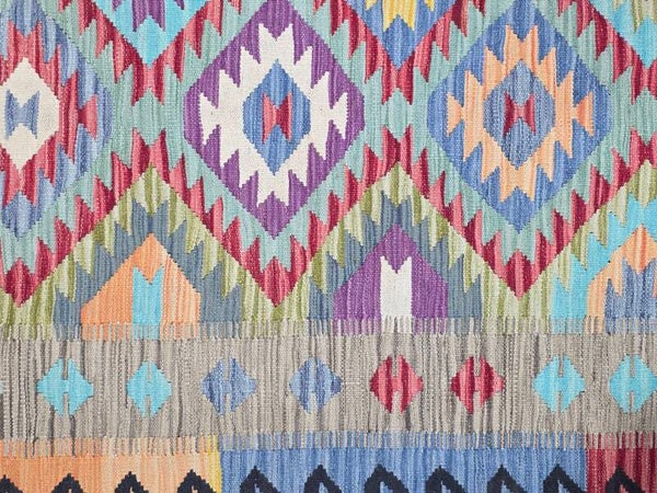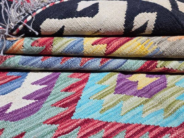 Le Kilim afghan est un type de tapis qui se distingue par sa technique de tissage et son origine tribale. Contrairement aux tapis afghans traditionnels qui sont noués, les kilims sont tissés, ce qui leur confère des caractéristiques uniques. Le kilim afghan est un tapis tissé à plat, sans velours, ce qui le rend léger et souvent réversible. Fabriqué traditionnellement en laine de mouton, il se caractérise par ses motifs géométriques et ses couleurs vives obtenues à partir de teintures naturelles. Il s'agit d'un artisanat tribal qui reflète les traditions des peuples nomades afghans.