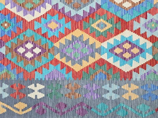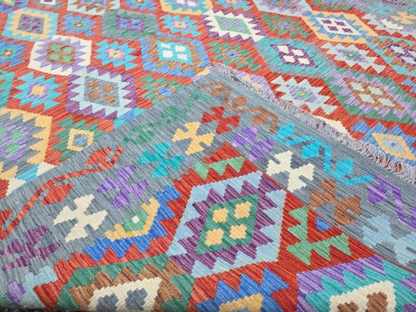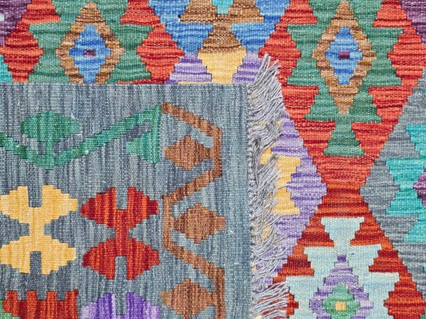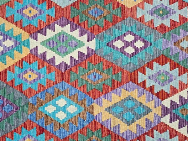 Le Kilim afghan est un type de tapis qui se distingue par sa technique de tissage et son origine tribale. Contrairement aux tapis afghans traditionnels qui sont noués, les kilims sont tissés, ce qui leur confère des caractéristiques uniques. Le kilim afghan est un tapis tissé à plat, sans velours, ce qui le rend léger et souvent réversible. Fabriqué traditionnellement en laine de mouton, il se caractérise par ses motifs géométriques et ses couleurs vives obtenues à partir de teintures naturelles. Il s'agit d'un artisanat tribal qui reflète les traditions des peuples nomades afghans.