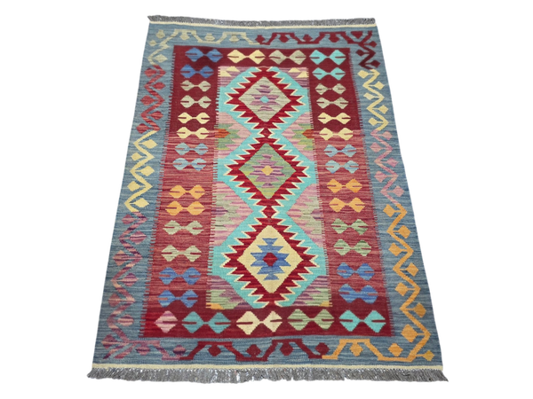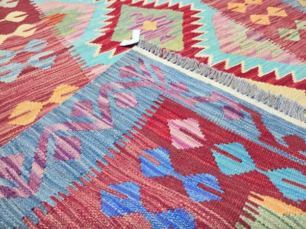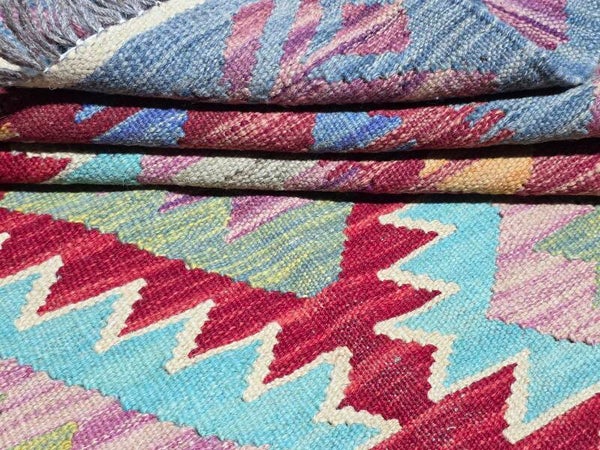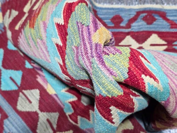 Le Kilim afghan est un type de tapis qui se distingue par sa technique de tissage et son origine tribale. Contrairement aux tapis afghans traditionnels qui sont noués, les kilims sont tissés, ce qui leur confère des caractéristiques uniques. Le kilim afghan est un tapis tissé à plat, sans velours, ce qui le rend léger et souvent réversible. Fabriqué traditionnellement en laine de mouton, il se caractérise par ses motifs géométriques et ses couleurs vives obtenues à partir de teintures naturelles. Il s'agit d'un artisanat tribal qui reflète les traditions des peuples nomades afghans.