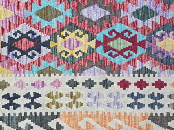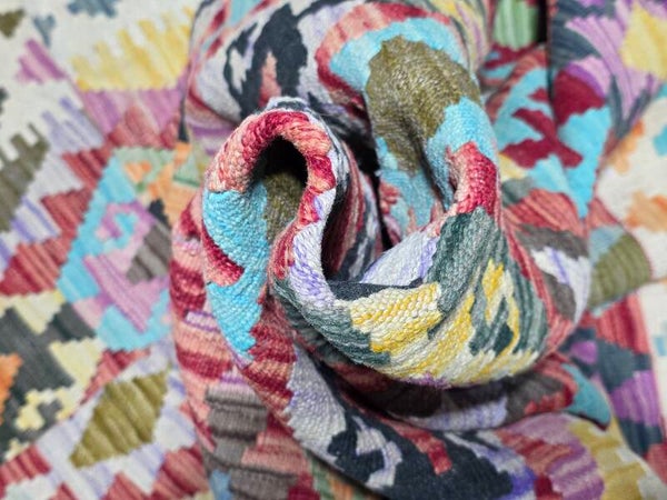Le Kilim afghan est un type de tapis qui se distingue par sa technique de tissage et son origine tribale. Contrairement aux tapis afghans traditionnels qui sont noués, les kilims sont tissés, ce qui leur confère des caractéristiques uniques. Le kilim afghan est un tapis tissé à plat, sans velours, ce qui le rend léger et souvent réversible. Fabriqué traditionnellement en laine de mouton, il se caractérise par ses motifs géométriques et ses couleurs vives obtenues à partir de teintures naturelles. Il s'agit d'un artisanat tribal qui reflète les traditions des peuples nomades afghans.