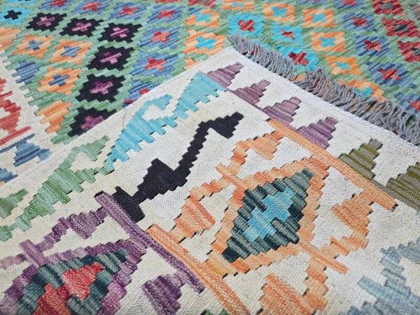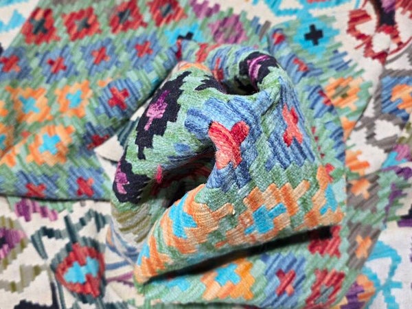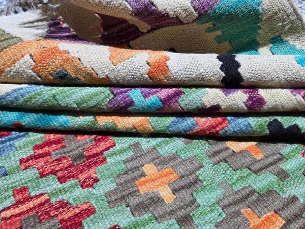 Le Kilim afghan est un type de tapis qui se distingue par sa technique de tissage et son origine tribale. Contrairement aux tapis afghans traditionnels qui sont noués, les kilims sont tissés, ce qui leur confère des caractéristiques uniques. Le kilim afghan est un tapis tissé à plat, sans velours, ce qui le rend léger et souvent réversible. Fabriqué traditionnellement en laine de mouton, il se caractérise par ses motifs géométriques et ses couleurs vives obtenues à partir de teintures naturelles. Il s'agit d'un artisanat tribal qui reflète les traditions des peuples nomades afghans.