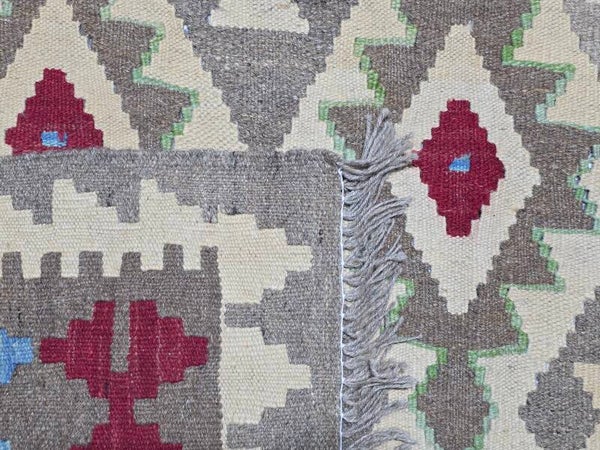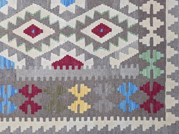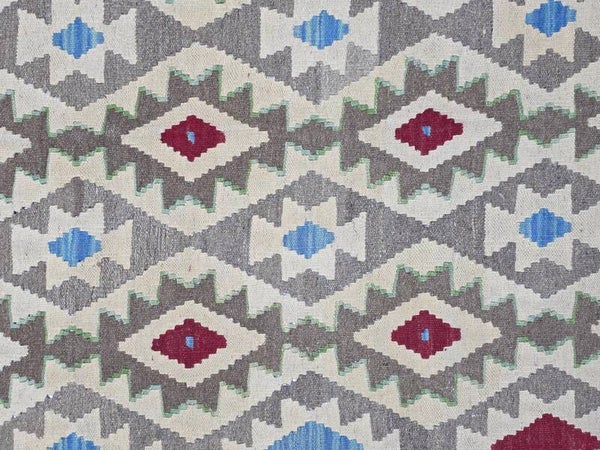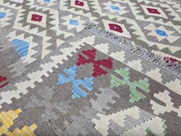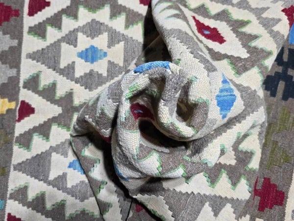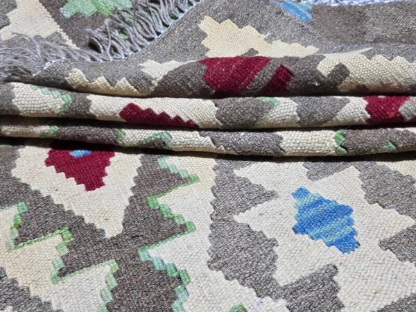 Le Kilim afghan est un type de tapis qui se distingue par sa technique de tissage et son origine tribale. Contrairement aux tapis afghans traditionnels qui sont noués, les kilims sont tissés, ce qui leur confère des caractéristiques uniques. Le kilim afghan est un tapis tissé à plat, sans velours, ce qui le rend léger et souvent réversible. Fabriqué traditionnellement en laine de mouton, il se caractérise par ses motifs géométriques et ses couleurs vives obtenues à partir de teintures naturelles. Il s'agit d'un artisanat tribal qui reflète les traditions des peuples nomades afghans.