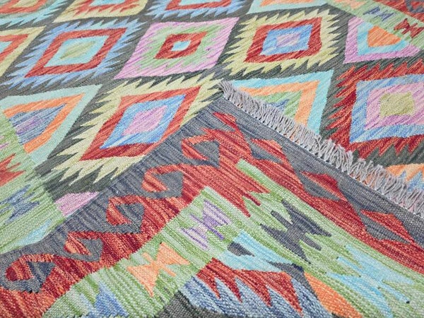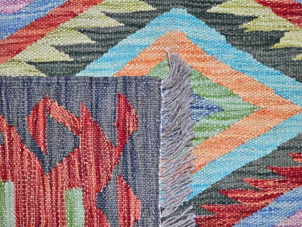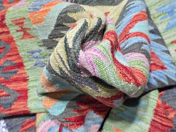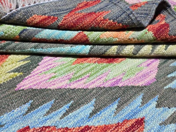 Le Kilim afghan est un type de tapis qui se distingue par sa technique de tissage et son origine tribale. Contrairement aux tapis afghans traditionnels qui sont noués, les kilims sont tissés, ce qui leur confère des caractéristiques uniques. Le kilim afghan est un tapis tissé à plat, sans velours, ce qui le rend léger et souvent réversible. Fabriqué traditionnellement en laine de mouton, il se caractérise par ses motifs géométriques et ses couleurs vives obtenues à partir de teintures naturelles. Il s'agit d'un artisanat tribal qui reflète les traditions des peuples nomades afghans.