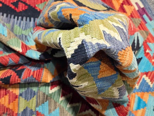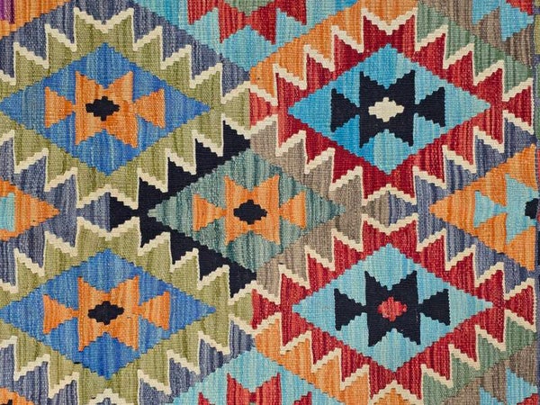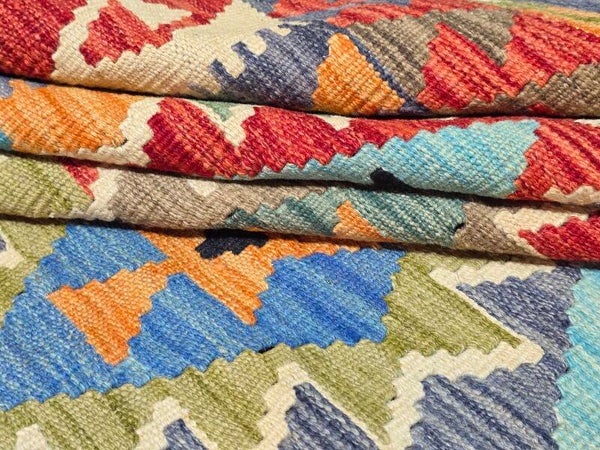 Le Kilim afghan est un type de tapis qui se distingue par sa technique de tissage et son origine tribale. Contrairement aux tapis afghans traditionnels qui sont noués, les kilims sont tissés, ce qui leur confère des caractéristiques uniques. Le kilim afghan est un tapis tissé à plat, sans velours, ce qui le rend léger et souvent réversible. Fabriqué traditionnellement en laine de mouton, il se caractérise par ses motifs géométriques et ses couleurs vives obtenues à partir de teintures naturelles. Il s'agit d'un artisanat tribal qui reflète les traditions des peuples nomades afghans.