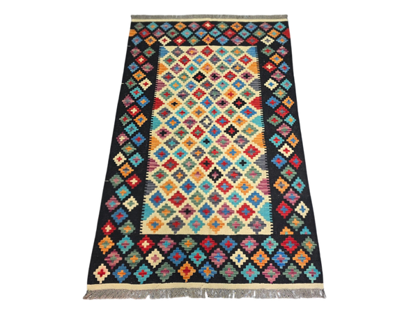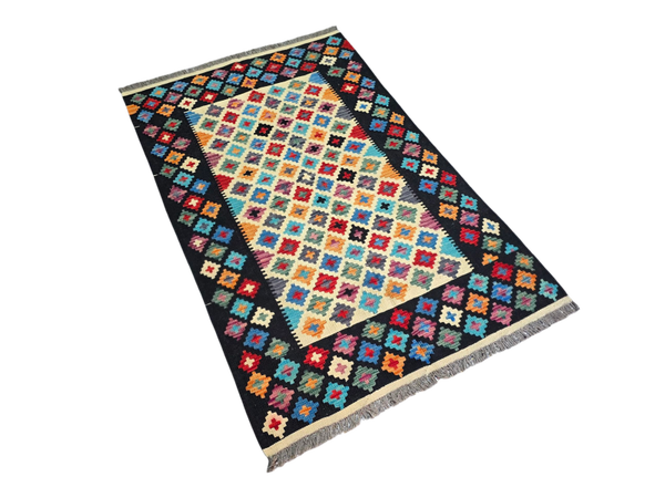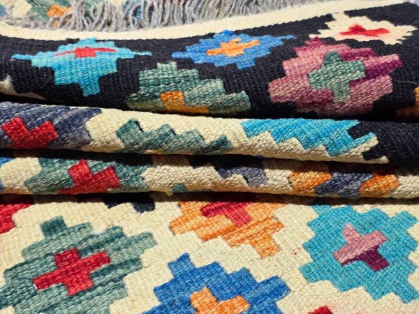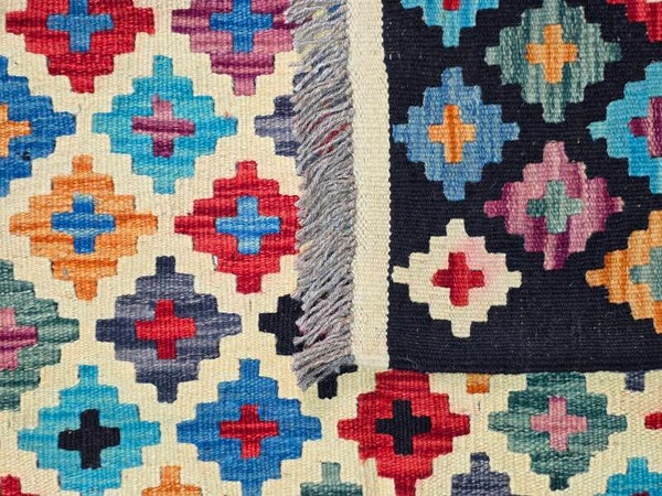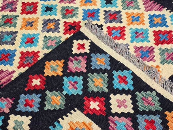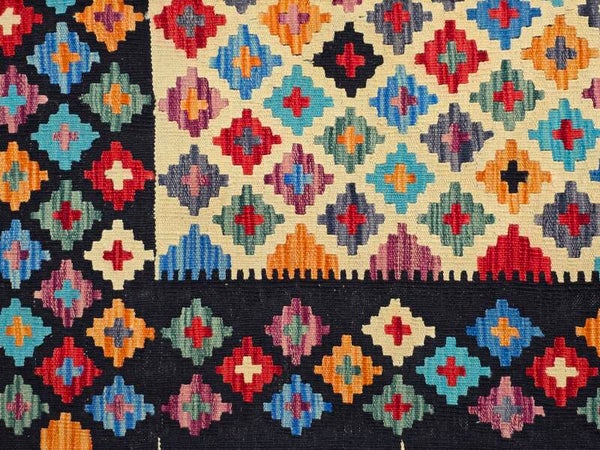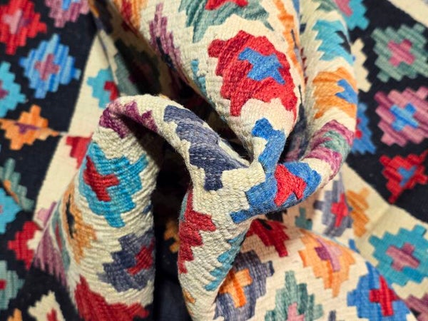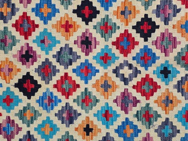 Le Kilim afghan est un type de tapis qui se distingue par sa technique de tissage et son origine tribale. Contrairement aux tapis afghans traditionnels qui sont noués, les kilims sont tissés, ce qui leur confère des caractéristiques uniques. Le kilim afghan est un tapis tissé à plat, sans velours, ce qui le rend léger et souvent réversible. Fabriqué traditionnellement en laine de mouton, il se caractérise par ses motifs géométriques et ses couleurs vives obtenues à partir de teintures naturelles. Il s'agit d'un artisanat tribal qui reflète les traditions des peuples nomades afghans.