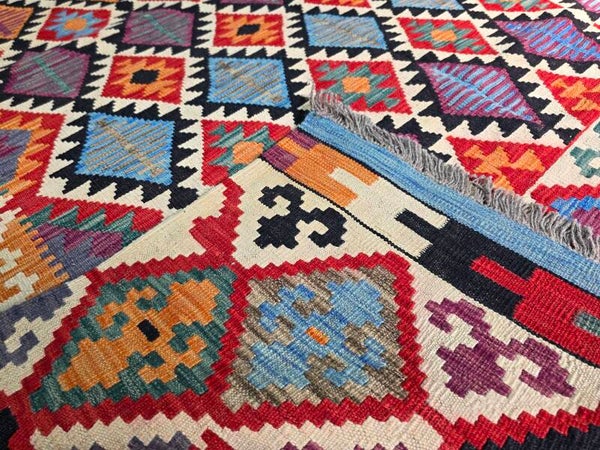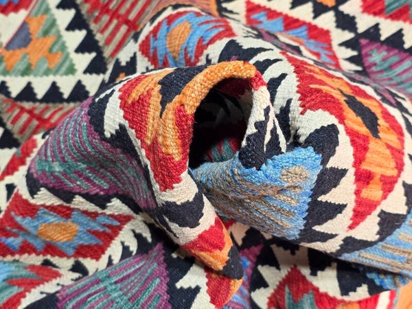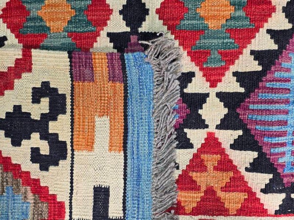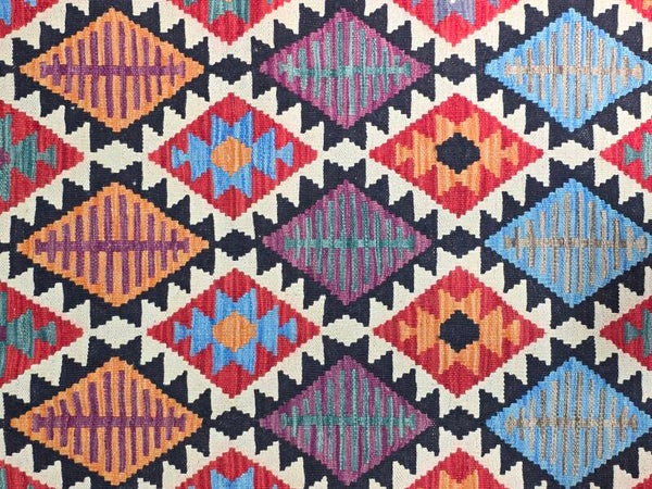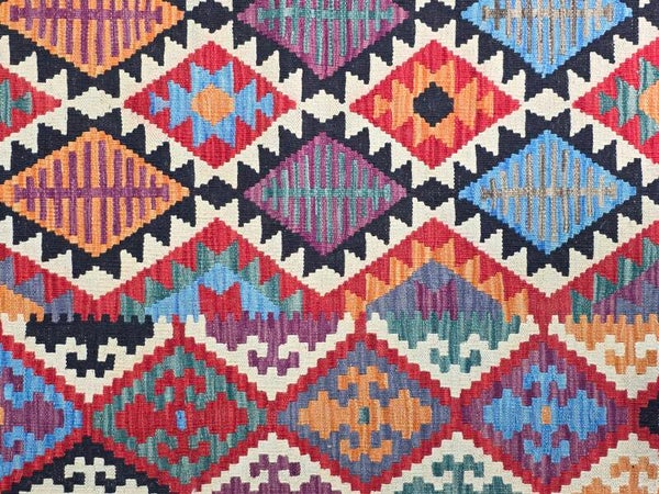 Le Kilim afghan est un type de tapis qui se distingue par sa technique de tissage et son origine tribale. Contrairement aux tapis afghans traditionnels qui sont noués, les kilims sont tissés, ce qui leur confère des caractéristiques uniques. Le kilim afghan est un tapis tissé à plat, sans velours, ce qui le rend léger et souvent réversible. Fabriqué traditionnellement en laine de mouton, il se caractérise par ses motifs géométriques et ses couleurs vives obtenues à partir de teintures naturelles. Il s'agit d'un artisanat tribal qui reflète les traditions des peuples nomades afghans.