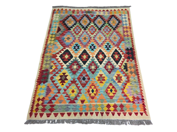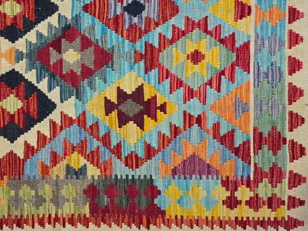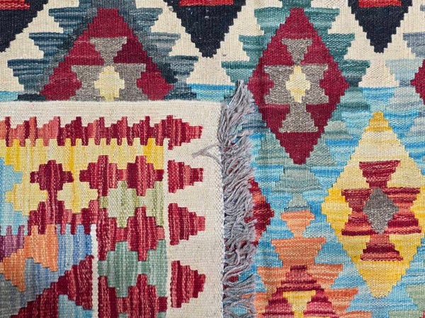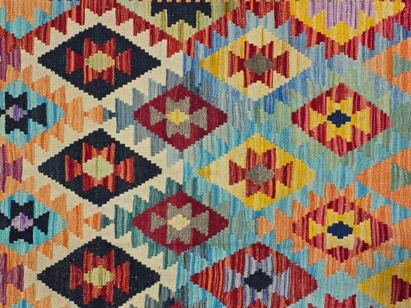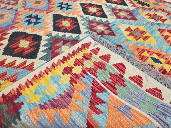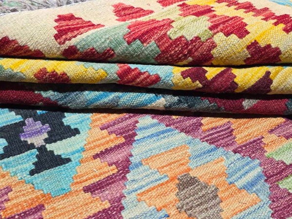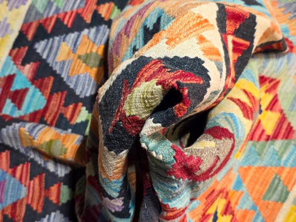 Le Kilim afghan est un type de tapis qui se distingue par sa technique de tissage et son origine tribale. Contrairement aux tapis afghans traditionnels qui sont noués, les kilims sont tissés, ce qui leur confère des caractéristiques uniques. Le kilim afghan est un tapis tissé à plat, sans velours, ce qui le rend léger et souvent réversible. Fabriqué traditionnellement en laine de mouton, il se caractérise par ses motifs géométriques et ses couleurs vives obtenues à partir de teintures naturelles. Il s'agit d'un artisanat tribal qui reflète les traditions des peuples nomades afghans.