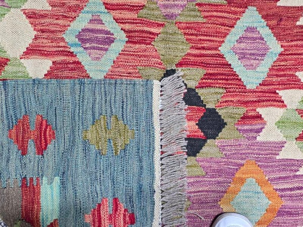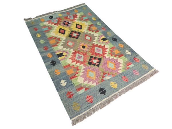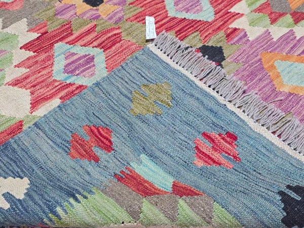 Le Kilim afghan est un type de tapis qui se distingue par sa technique de tissage et son origine tribale. Contrairement aux tapis afghans traditionnels qui sont noués, les kilims sont tissés, ce qui leur confère des caractéristiques uniques. Le kilim afghan est un tapis tissé à plat, sans velours, ce qui le rend léger et souvent réversible. Fabriqué traditionnellement en laine de mouton, il se caractérise par ses motifs géométriques et ses couleurs vives obtenues à partir de teintures naturelles. Il s'agit d'un artisanat tribal qui reflète les traditions des peuples nomades afghans.