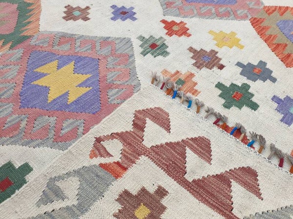 Tapis Kilim Géométrique 193x147 multicolore tissé en laine