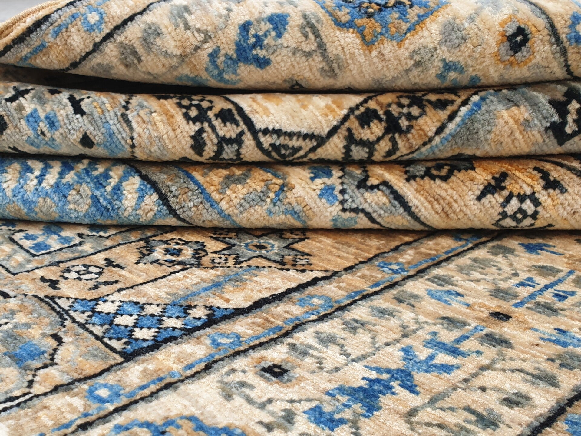 Aujourd’hui, ce style historique a été magistralement préservé et réinterprété par les artisans d’Afghanistan, héritiers d’une longue tradition de tissage oriental. Chaque tapis Mamelouk afghan est noué entièrement à la main avec de la laine filée à la main et souvent teintée avec des pigments naturels, perpétuant un savoir-faire transmis de génération en génération. Les motifs géométriques complexes, les bordures richement décorées et la symétrie remarquable témoignent d’un travail minutieux et d’une grande maîtrise technique. Au-delà de sa fonction décorative, ce tapis représente un véritable patrimoine culturel, reliant l’esthétique raffinée du monde islamique médiéval à l’artisanat contemporain d’Asie centrale.