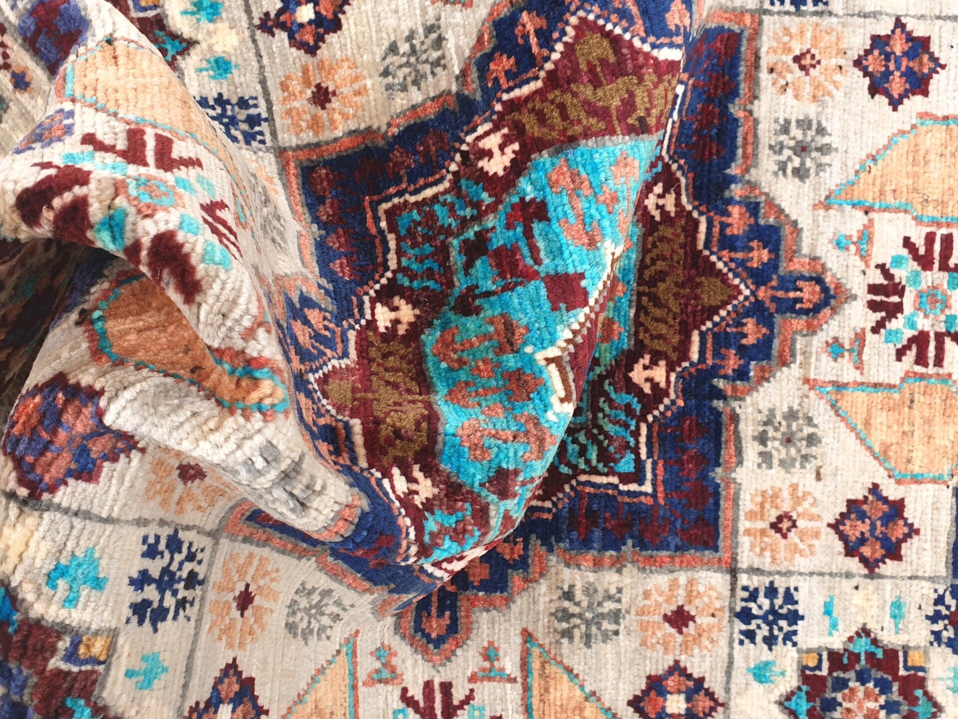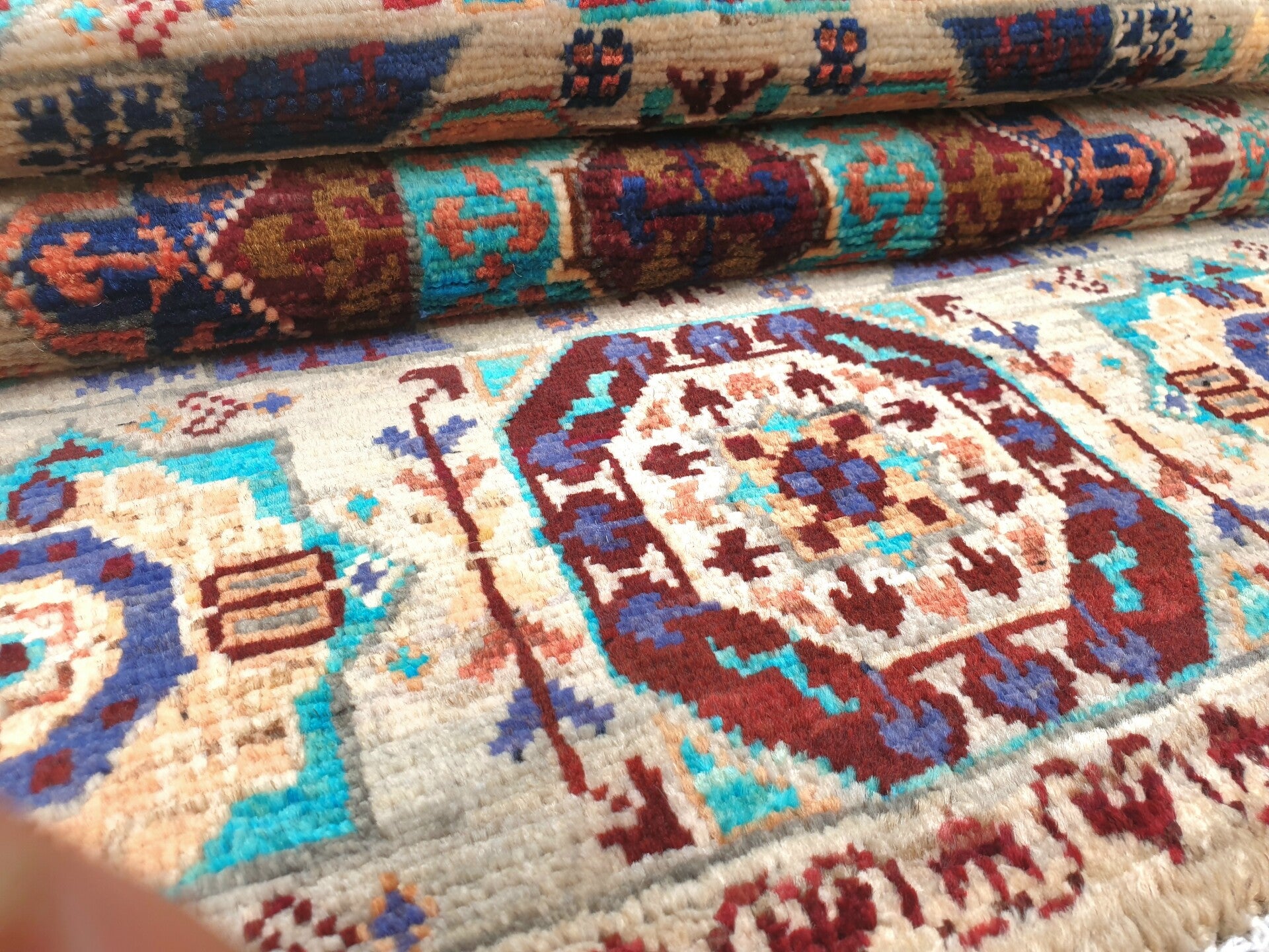Aujourd’hui, ce style historique a été magistralement préservé et réinterprété par les artisans d’Afghanistan, héritiers d’une longue tradition de tissage oriental. Chaque tapis Mamelouk afghan est noué entièrement à la main avec de la laine filée à la main et souvent teintée avec des pigments naturels, perpétuant un savoir-faire transmis de génération en génération. Les motifs géométriques complexes, les bordures richement décorées et la symétrie remarquable témoignent d’un travail minutieux et d’une grande maîtrise technique. Au-delà de sa fonction décorative, ce tapis représente un véritable patrimoine culturel, reliant l’esthétique raffinée du monde islamique médiéval à l’artisanat contemporain d’Asie centrale.
